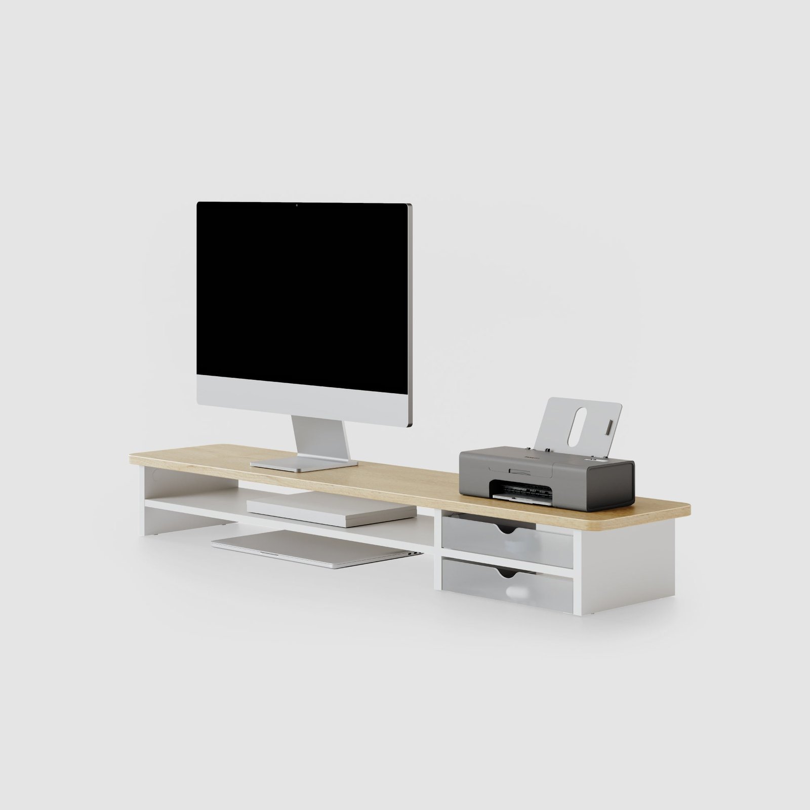 This desktop monitor riser shelf is designed to support screens at a more comfortable eye level during everyday work. The wide top surface provides stable placement for standard monitors and allows room for small desk items. Its flat design helps distribute weight evenly across the desk. Open space beneath the shelf can be used to store a keyboard, notebook, or accessories when not in use. The overall form supports a clean and organized workspace and fits well in home offices, study areas, and professional desks.